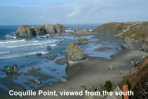 Coquille Point is one of the most visited viewpoints on the southern Oregon coast. Located just east of the Oregon Islands National Wildlife Refuge viewing area, our beach access to surf and shoreline coves is only a few steps away on well-maintained paths and wide stairs. Sea life and rocky-shore birds abound in this area. The meandering pathways of the Viewing Area afford visitors the opportunity to observe the coastal ecology and the native beauty of the coastal headlands with ease. For the more adventurous, a trip to the beach puts you close up with harbor seals, cormorants, murres and sea gulls. Agate hunters, casual or serious, stroll the tide break looking for the perfect find. The sandy beach will challenge any child's imagination in the construction of a sand castle. Every member of the family can enjoy the fun of kite flying. And of course there is always the sea.